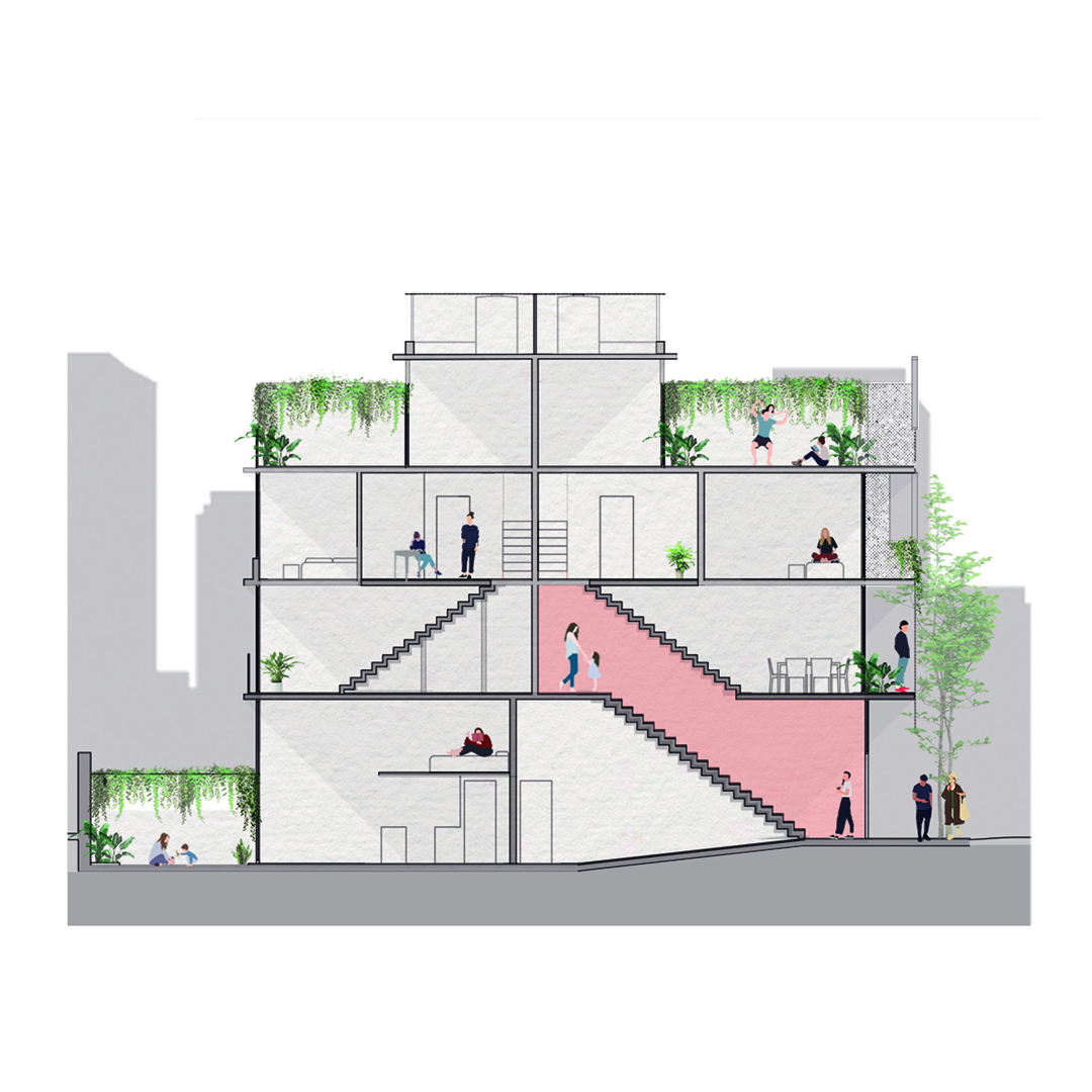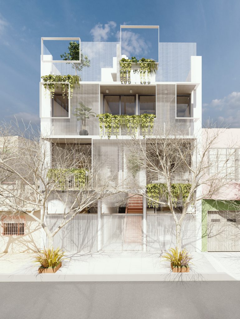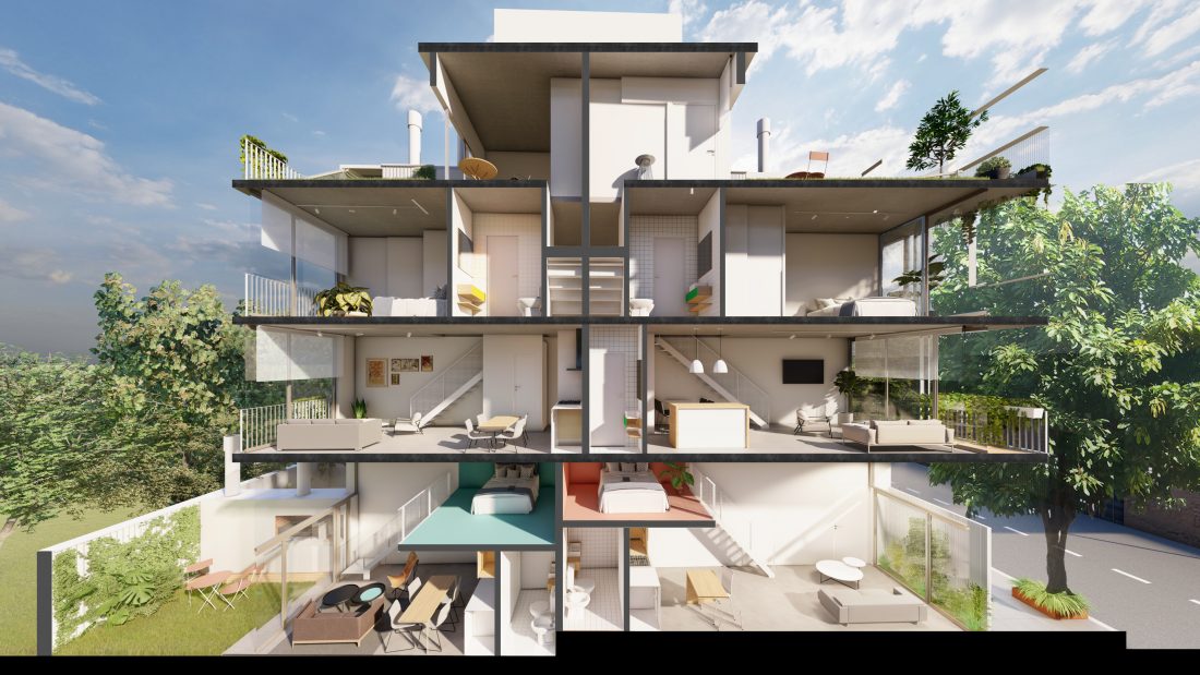 Este proyecto explora la idea de CASAS EN ALTURA, como alternativa a los tradicionales edificios de Propiedad Horizontal. Esta mixtura de pequeñas “casas” con diversos espacios de expansión, vegetación van conformando cómodos refugios en medio de la ciudad