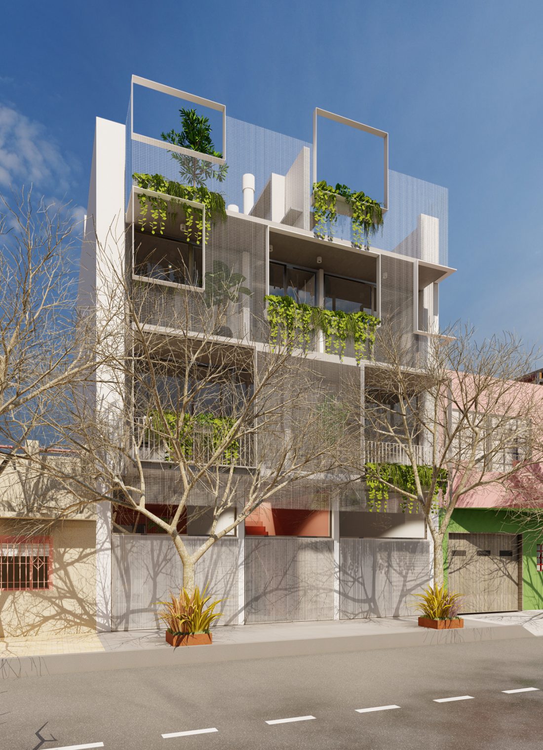 El edificio propone un juego volumétrico, entre las distintas unidades y los espacios verdes de transición y expansión. La piel -malla metálica- posee una triple potencialidad: primero, la de proporcionar una superficie que funciona como tamiz de la luz y de circulación del aire. Por otro lado, provee de privacidad a las unidades, y a los espacios de expansión. Finalmente, la piel crea una sutil composición, conjuntamente con el uso del hormigón y la abundante vegetación, dotando al edificio de una imagen singular que se vincula armoniosamente con el entorno.