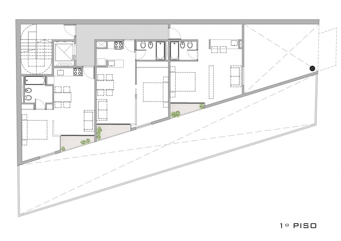 Cuenta con 15 unidades, tipo monoambientes, dos ambientes y tres ambientes. En planta baja se aloja el pasaje entre ambas calles, el hall de acceso y la zona de estacionamiento. En la última planta, se alojan las zonas comunes y de esparcimiento con la pileta al aire libre.