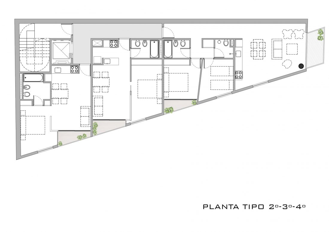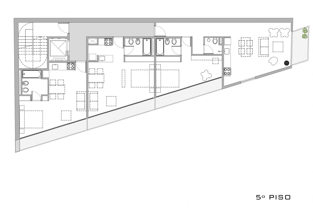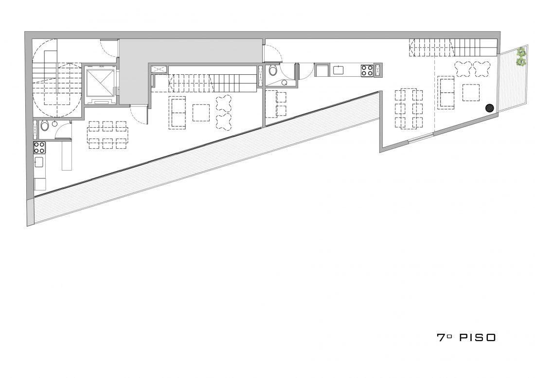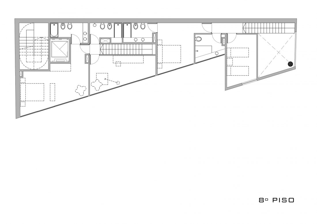 Este proyecto explora, por un lado, la tipología de edificio PASAJE, que le confiere a la obra y al lugar una particular cualidad urbana. Por otro, trabaja bajo la idea de la MASA HORADADA, a través del juego que propone con el sistema de expansiones y de aventanamientos.