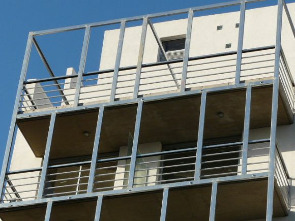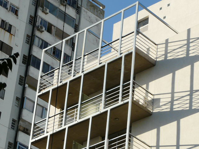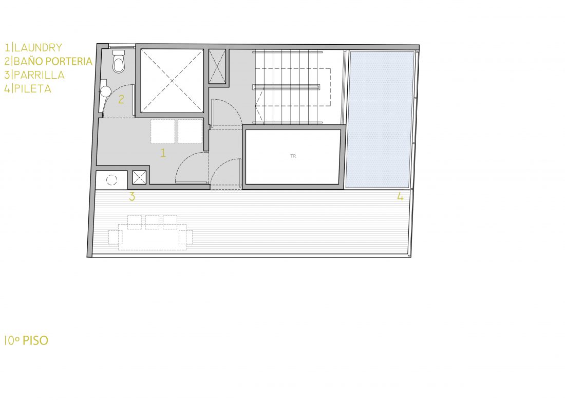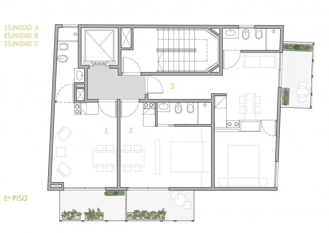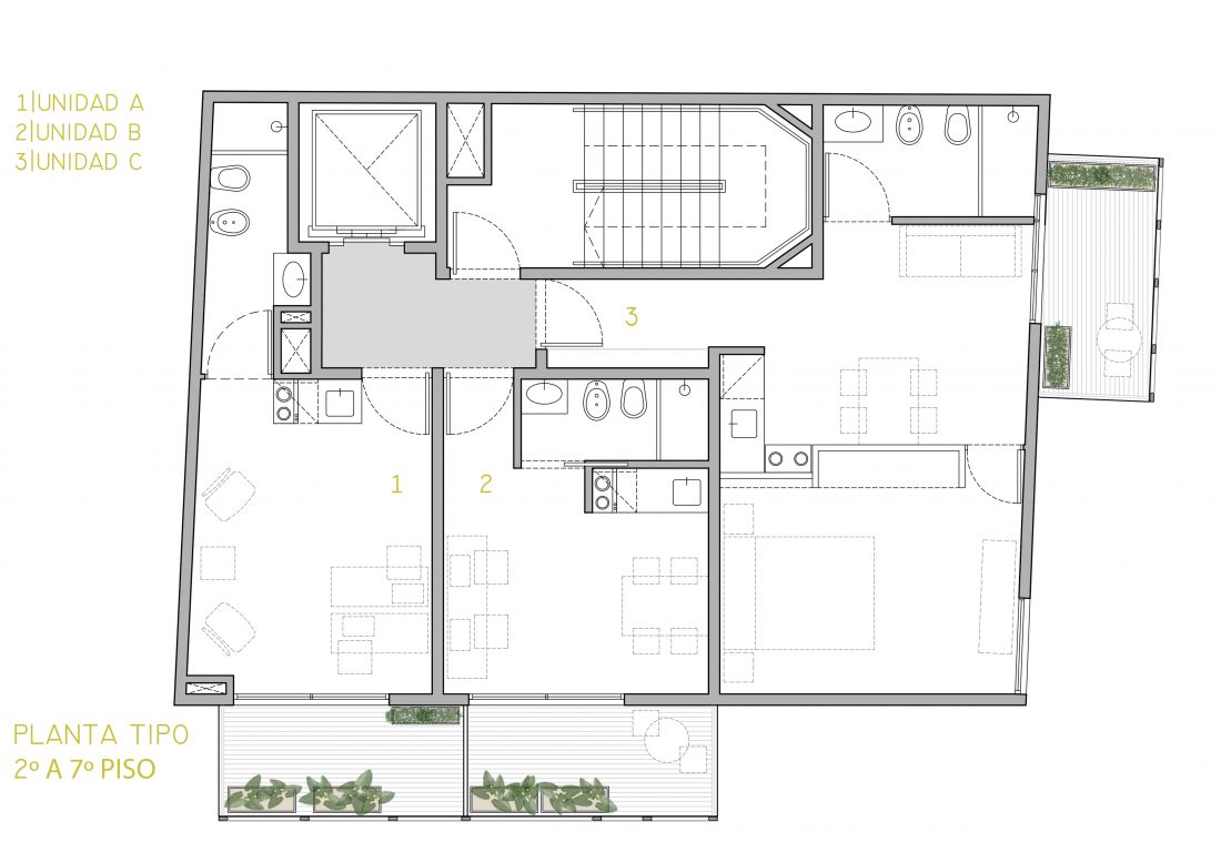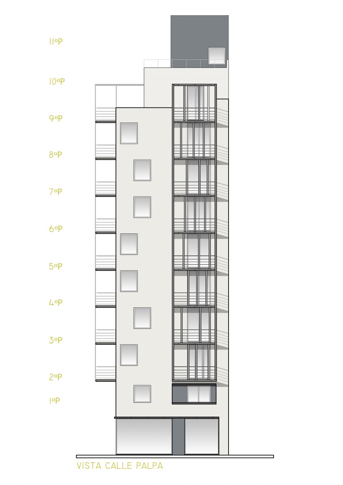 Este proyecto trabaja sobre la noción de SUPERPOSICIÓN DE TRAMAS, a través de un sistema alternado de perfiles galvanizados, que funcionan como parasoles y contenedor de las expansiones de las unidades.