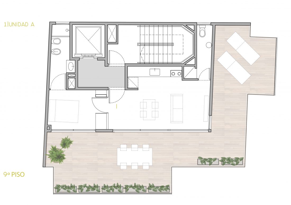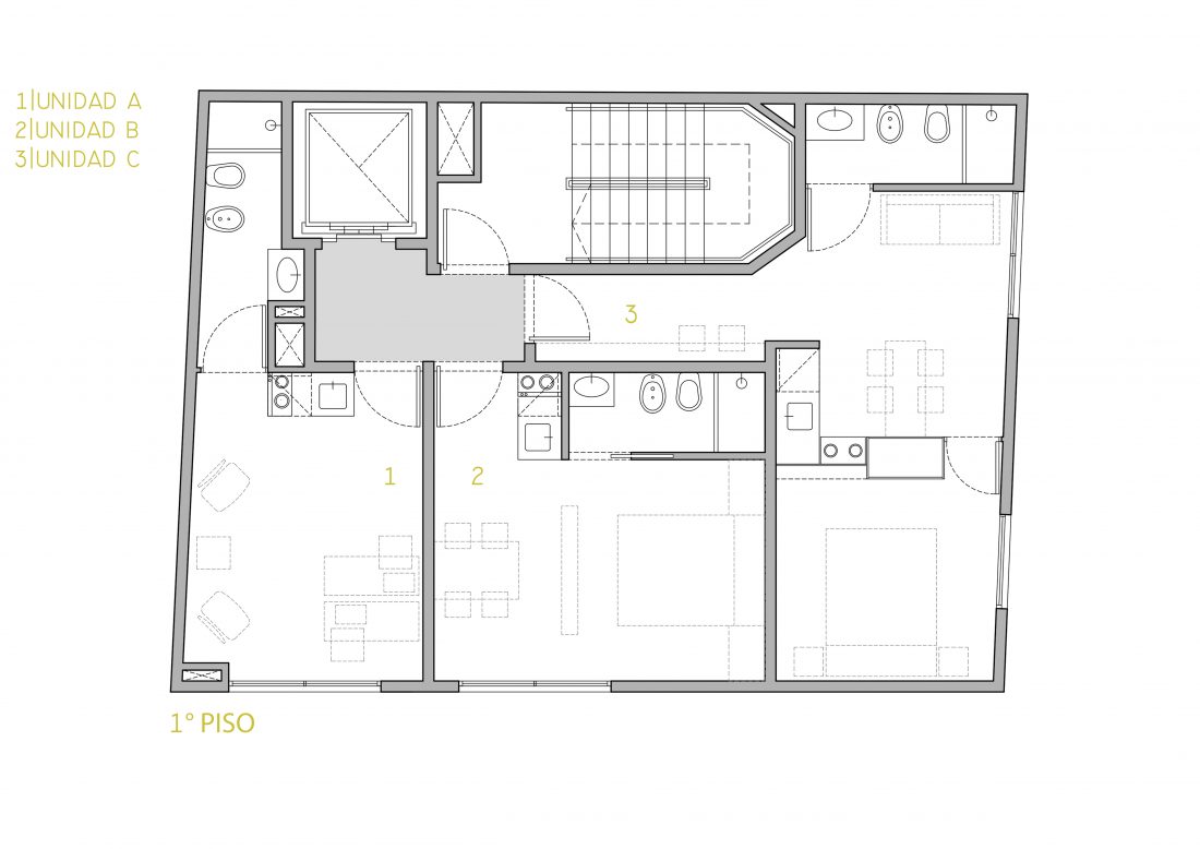 Cuenta con 25 unidades, tipo estudio, monoambientes y dos ambientes. En la Planta baja se aloja el hall de acceso y el sistema circulatorio, y tomando la esquina un local comercial.