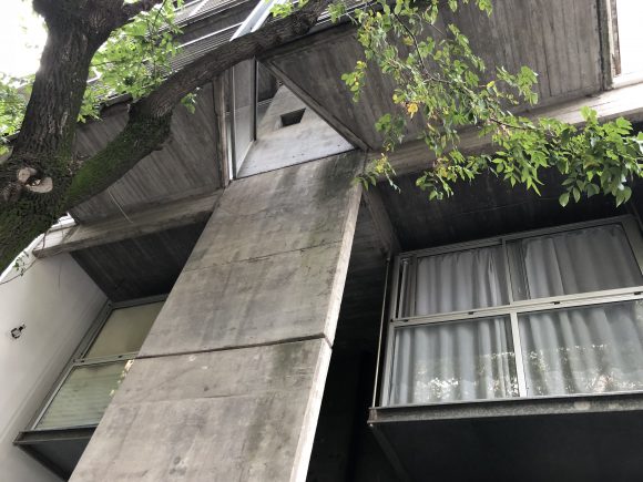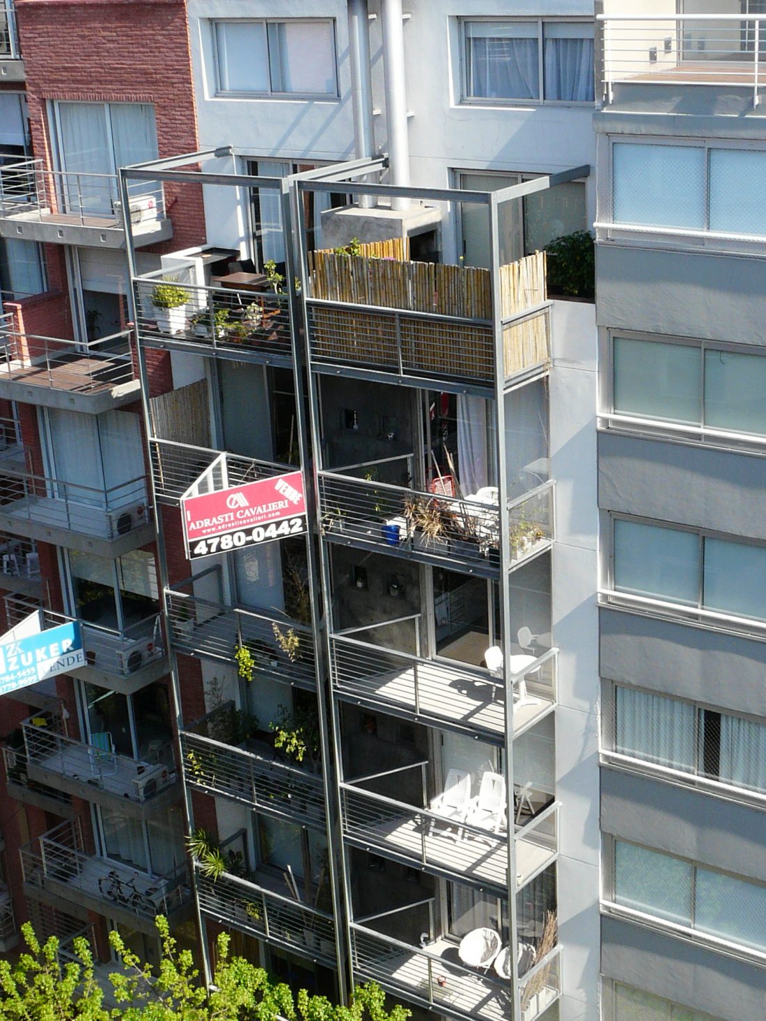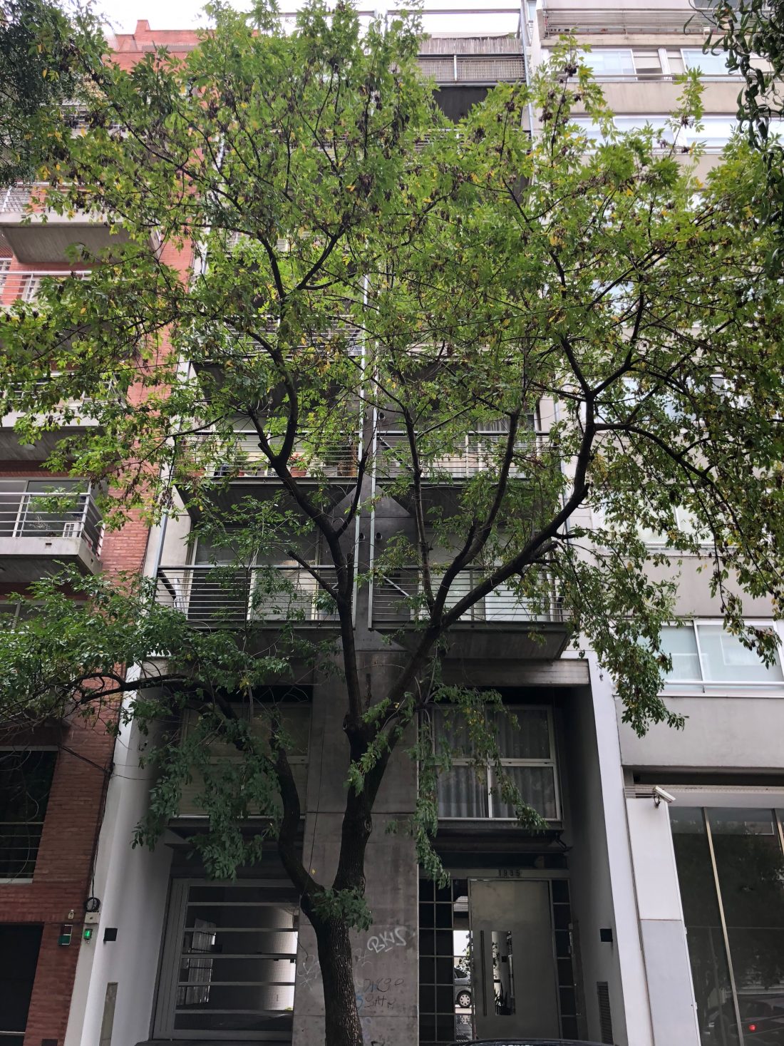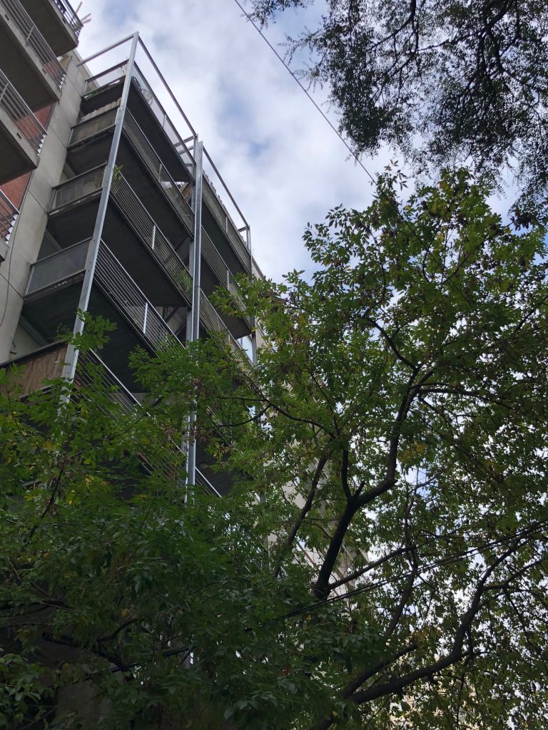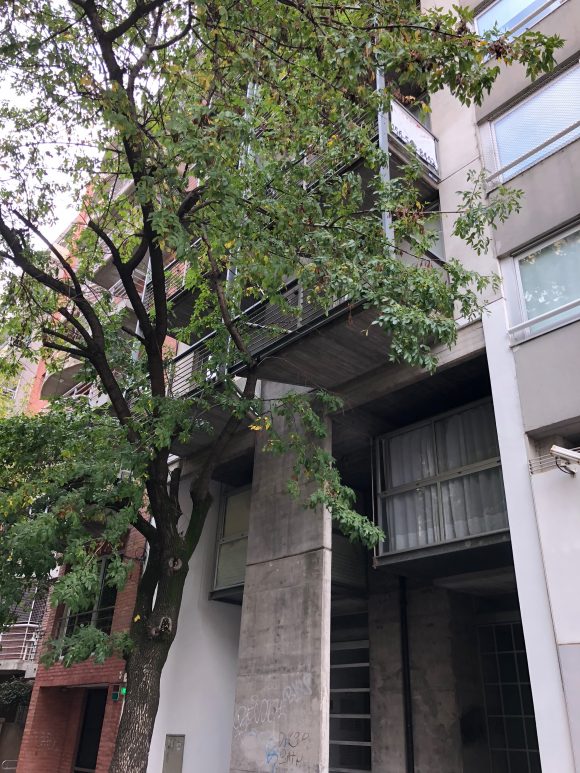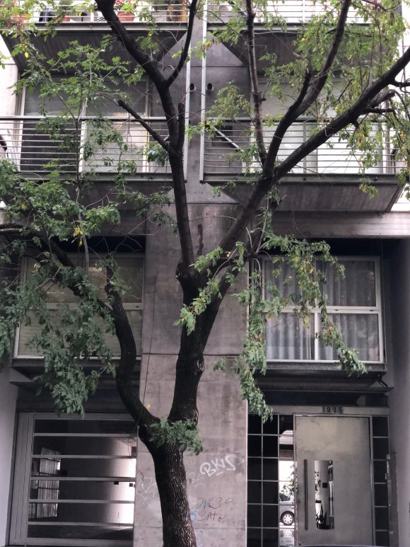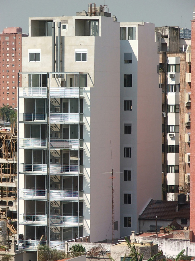 Cuenta con 28 unidades, tipo monoambiente, dos ambientes y triplex de 4 ambientes. En la planta baja libre se alojan los accesos, peatonal (cajas vidriadas) y vehicular, la zona de espacios guardacoches y la zona de esparcimiento con pileta descubierta y solarium. En planta baja el edificio se retira de la Linea oficial generando una doble altura, donde se encuentran suspendidas dos cajas de metal y vidrio que flotan en el espacio vacío.