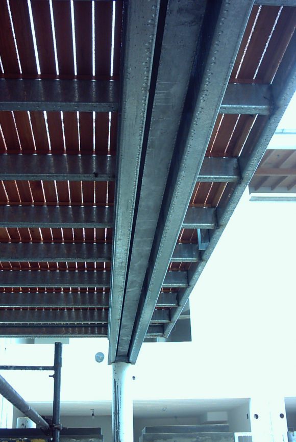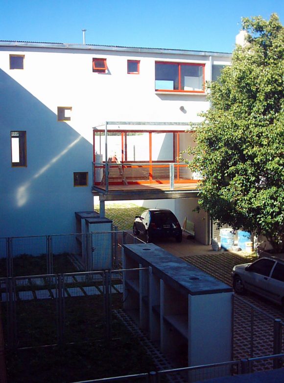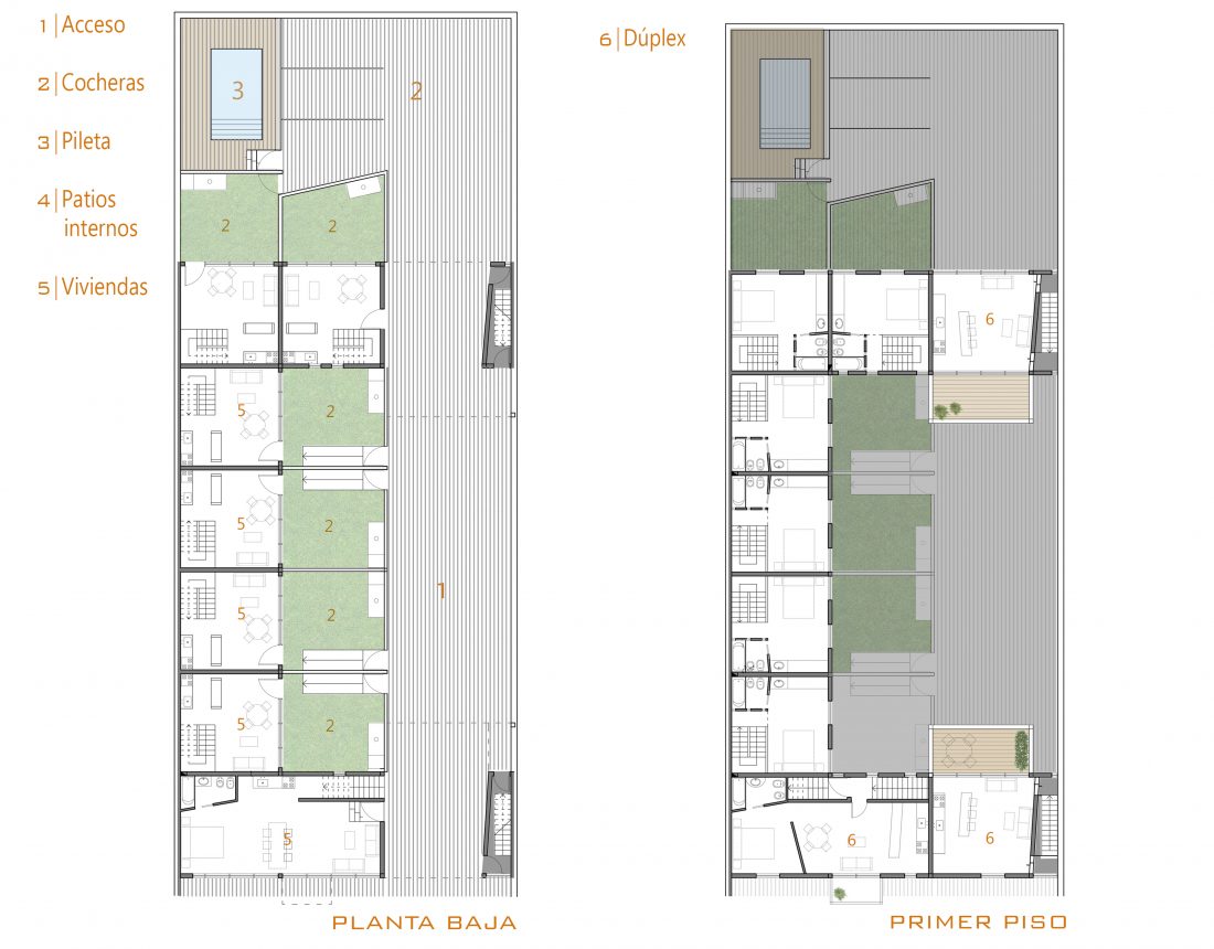 La planta en U esta conformada por un gran bloque recostado sobre una de las medianeras, donde se disponen las unidades en triplex, con jardines de acceso y expansión individual. Mientras que los bloques del frente y contrafrente, transversales al anterior, son volúmenes suspendidos, conformando dos grandes puentes de viviendas, donde se alojan unidades en duplex y unidades simples, con terrazas que sobrevuelan el espacio común.