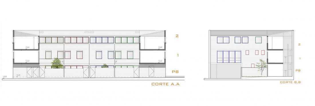 Cuenta con 10 unidades, de diferentes tamaños y características, todas con expansiones al exterior. En planta baja se alojan los dos patios comunes, las zonas de aparcamiento y los jardines de accesos a las viviendas.