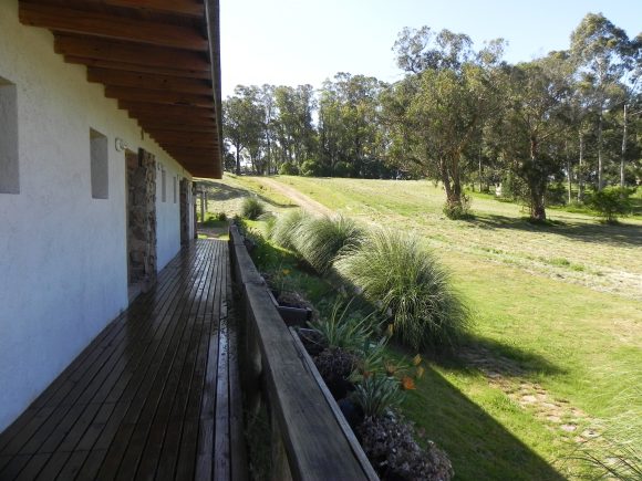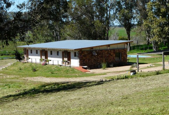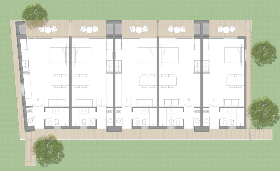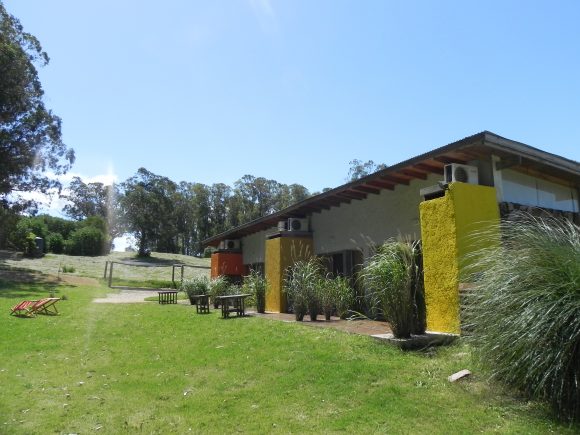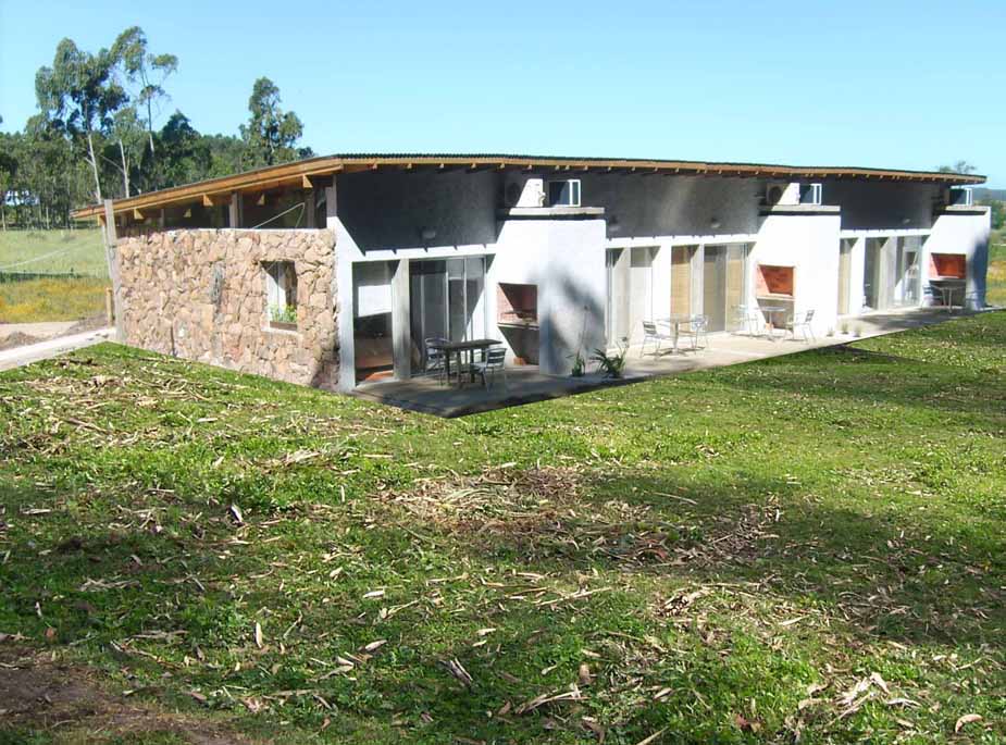 El proyecto aparece frente al visitante al final del camino rupestre, cinco unidades de igual tamaño y características, reunidas bajo la misma cubierta se construyen como una gran casa extendida. Maximizando su extensión en el sitio, se vuelca hacia el paisaje de manera de medir, tanto la longitud de los espacios interiores, como también la extensión del paisaje más próximo al proyecto. El gesto hacia el exterior y el constante intercambio con lo que está inmerso se acentúa a su vez, también, con su materialidad elegida.