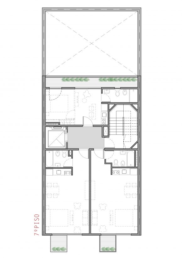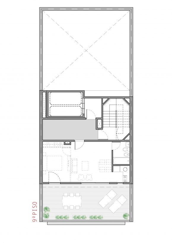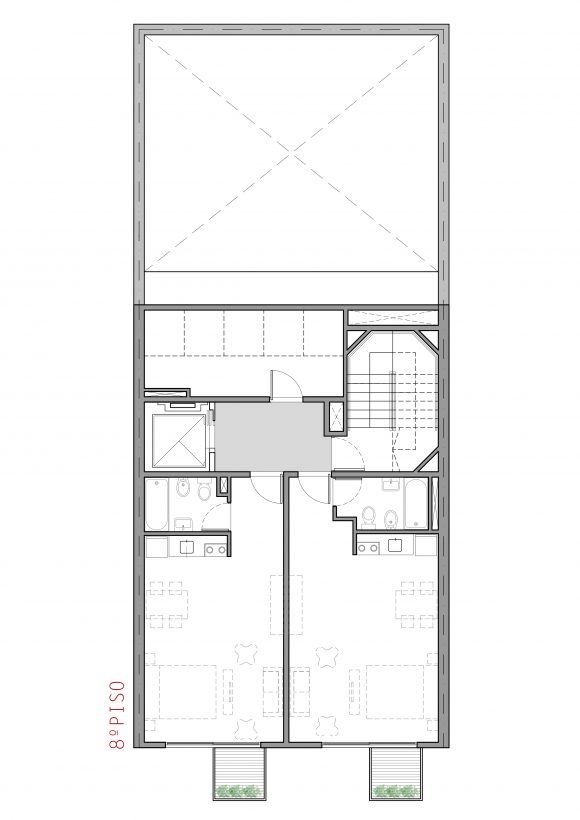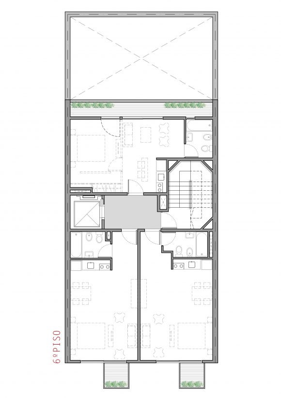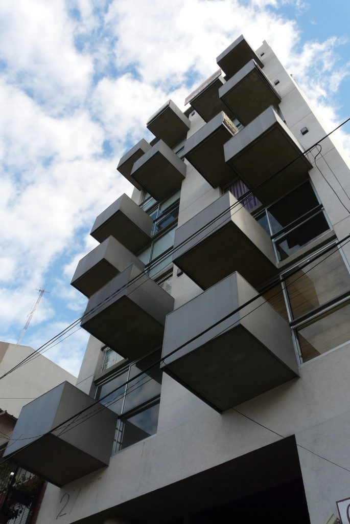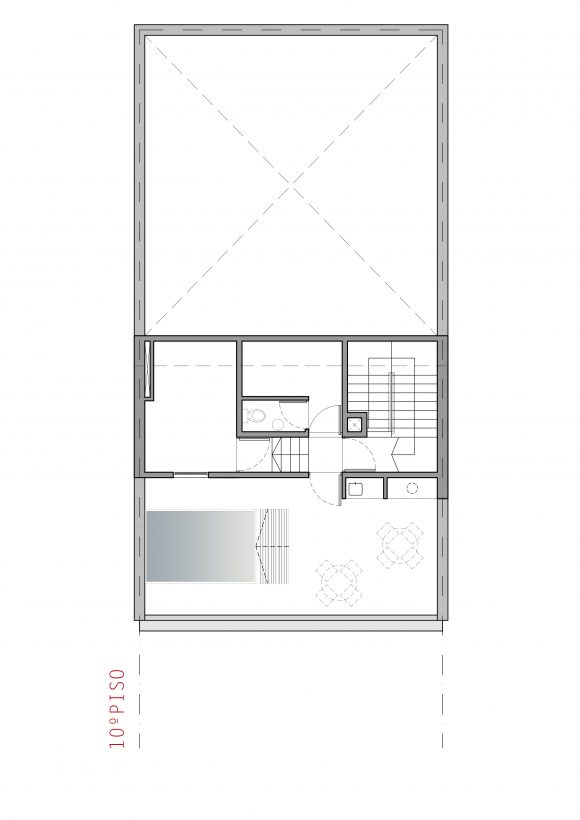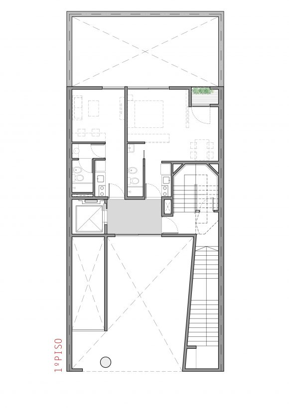 Cuenta con 25 unidades, tipo estudio, monoambientes y dos ambientes. En la planta baja abierta, se alojan los accesos, peatonal y vehicular, y en la última planta, las zonas comunes y de esparcimiento.