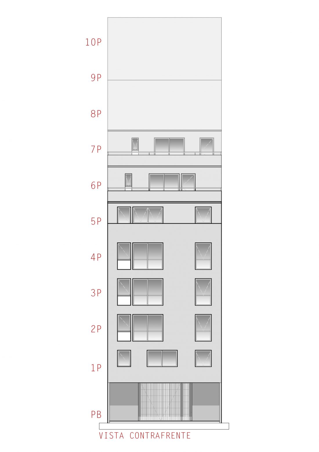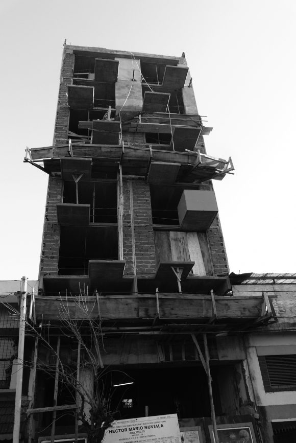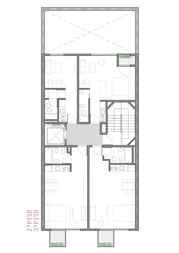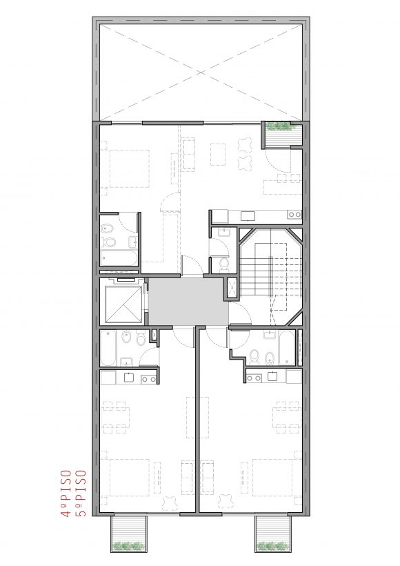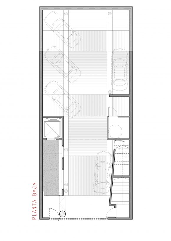 Cuenta con 25 unidades, tipo estudio, monoambientes y dos ambientes. En la planta baja abierta, se alojan los accesos, peatonal y vehicular, y en la última planta, las zonas comunes y de esparcimiento.